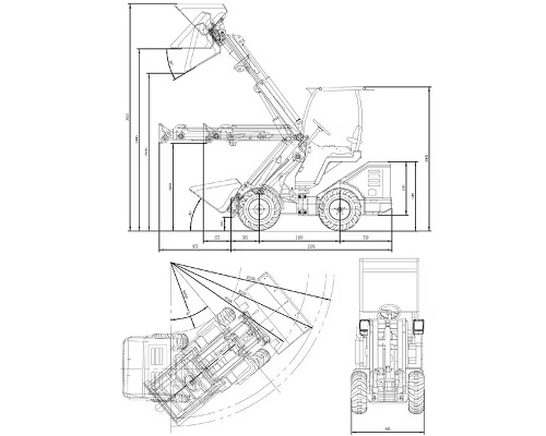 Грузоподъемность 650 кг, высота разгрузки 2750 см, , собственный вес 1100 кг, гидростатическая трансмиссия PWG, двигатель Kubota мощность 18,2 KW.